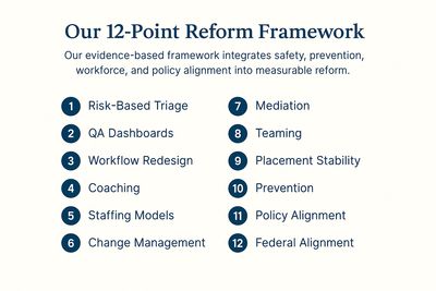 At The Collins Institute for Child & Family Systems, our 12-Point Child Welfare Reform Framework provides a roadmap for building safer, stronger, and more accountable systems. The framework unites evidence-based practices, workforce support, and policy alignment to improve outcomes for children and families.